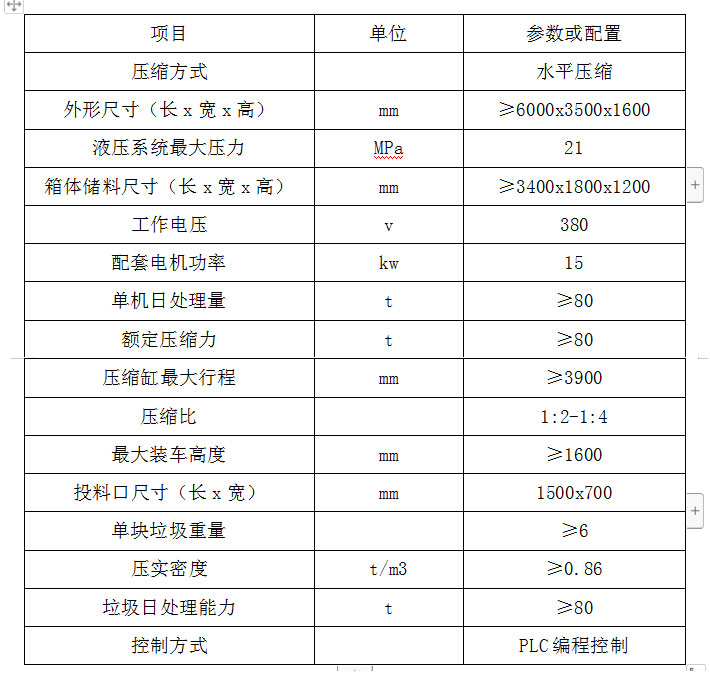 ◇全封閉水平壓縮:采用水平壓縮方式,垃圾壓縮密度≥0.86t/m3,垃圾壓縮后體積大大減小,從而大幅度提高轉(zhuǎn)運車輛裝載量和轉(zhuǎn)運效率,降低垃圾處理、轉(zhuǎn)運等費用;